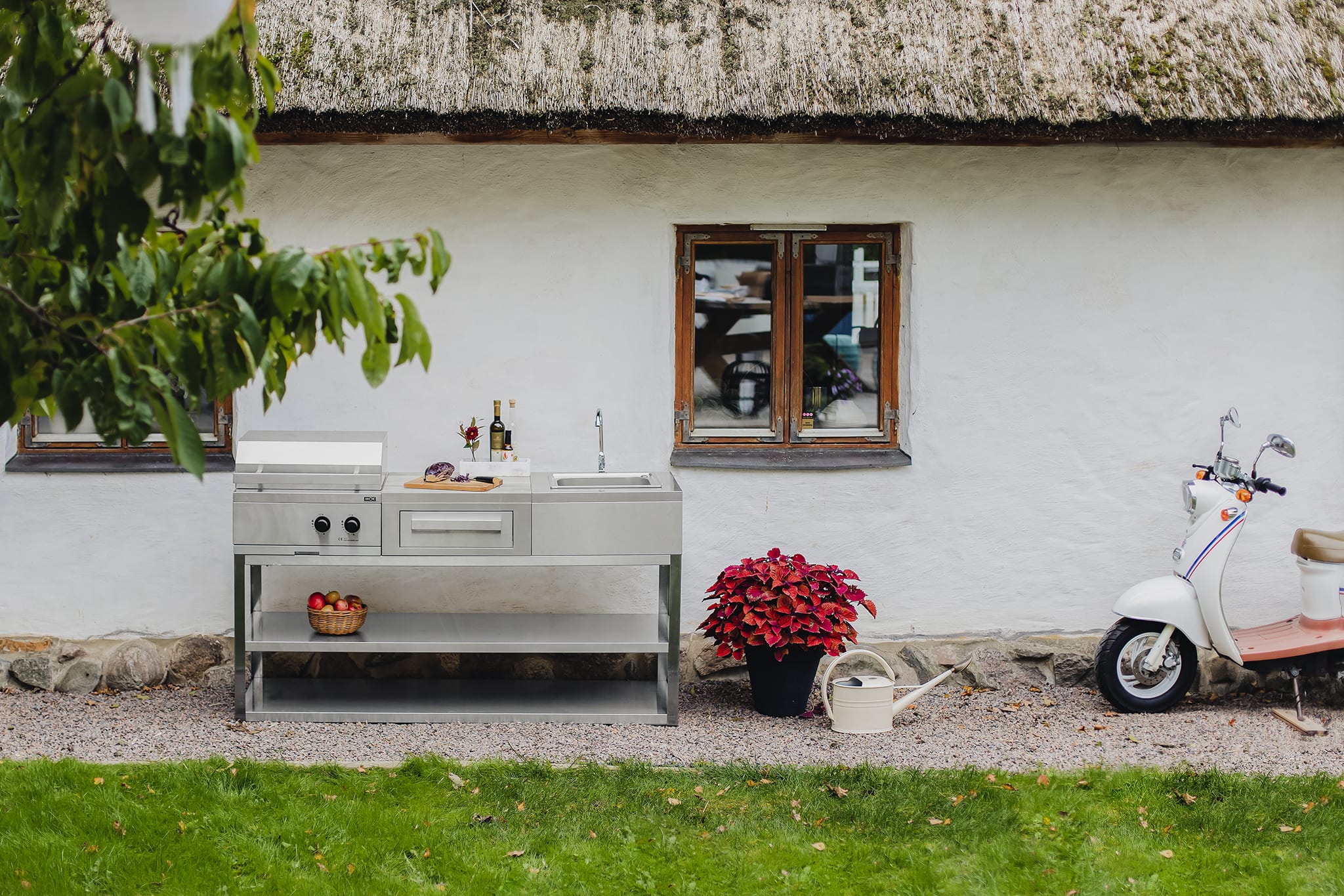 Nordic Line modulserien omfatter gasgrill (2 eller 5 brændere), en kulgrill, et modul med sidebrændere, et modul med vask, et arbejdsbord med opbevaring, et barmodul og et køleskabsmodul. Nordic Line - alt hvad du behøver for at skabe et udekøkken, der er både sofistikeret og fleksibelt.